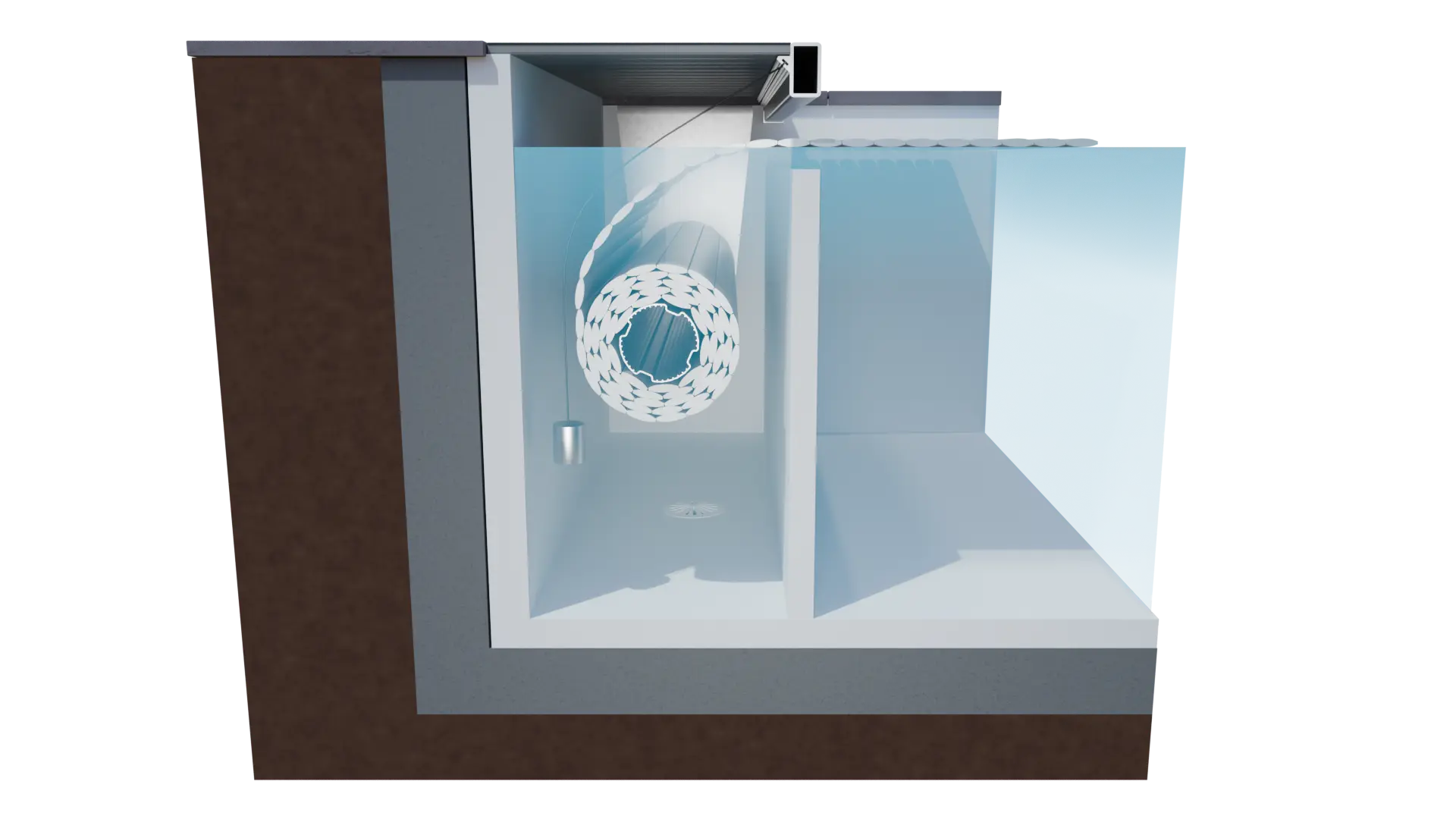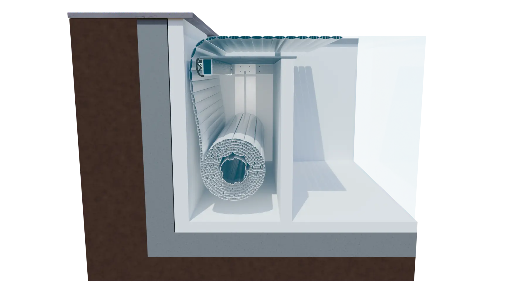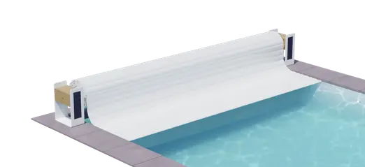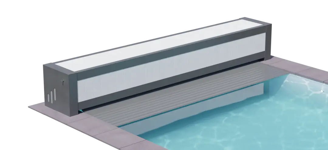 Le volet immergé Un’Roll 500 s’intègre dans une niche séparée du bassin par un mur de séparation. Cette niche accueille le mécanisme qui se trouve dissimulé sous un caillebotis, porté par une poutrelle en aluminium thermolaquée de manière à permettre un accès en permanence. Walter Pool permet une finition parfaite grâce à ses différentes possibilités comme le bois, ou l’aluminium thermolaqué.